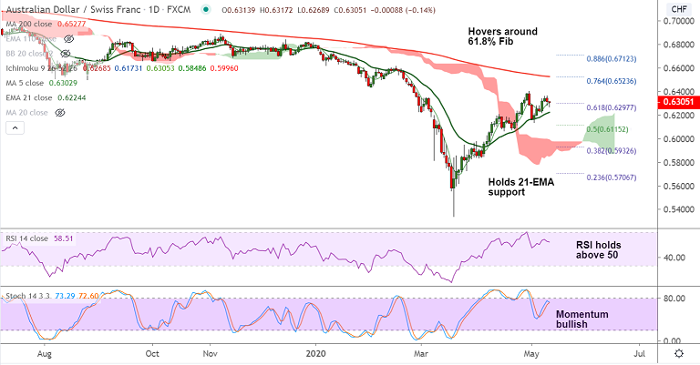 Support levels - 0.6307 (5-DMA), 0.6226 (21-EMA), 0.6204 (55-EMA)