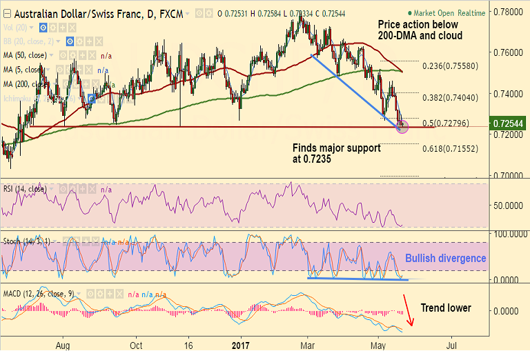 - AUD/CHF retraces from session lows at 0.7233, finds major trendline support at 0.7235.