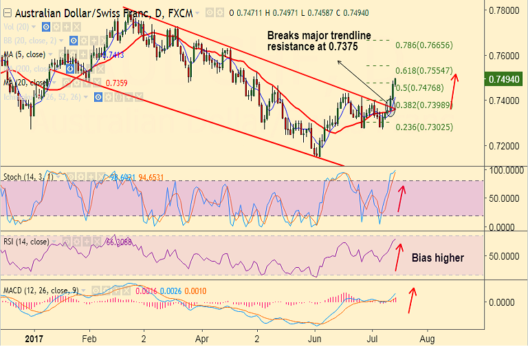- AUD/CHF extends bullish momentum after break above major channel top resistance at 0.7375.