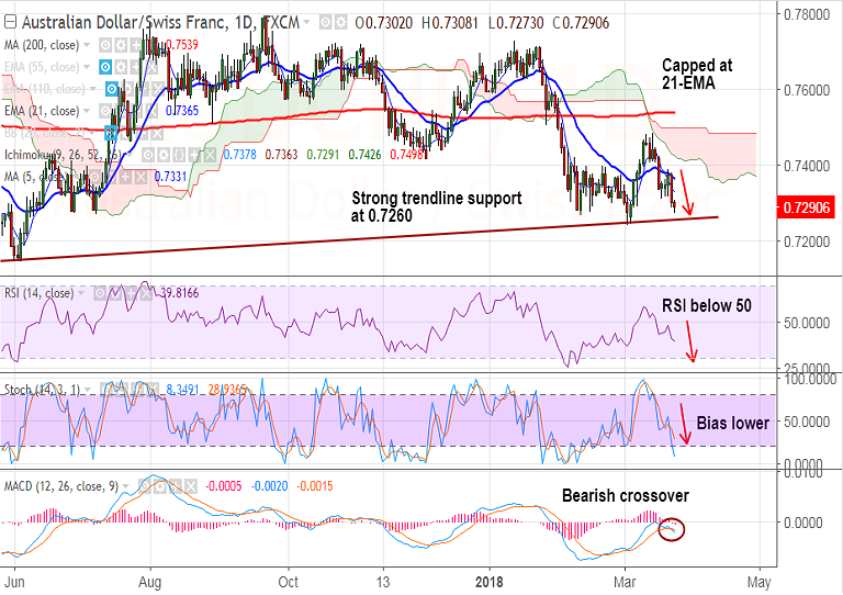 - On the flipside, 5-DMA at 0.7331 is immediate resistance. Breakout above 21-EMA invalidates bearish bias.