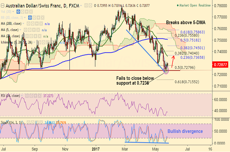 - AUD/CHF has erased losses and retraced back above 5-DMA currently at 0.7273.
