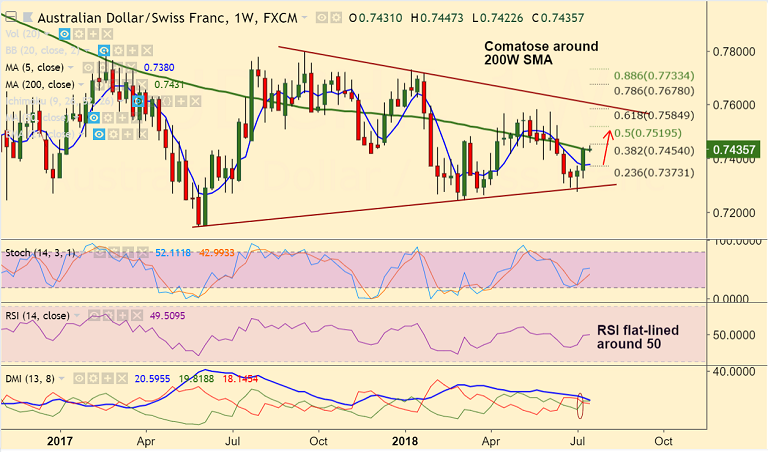 - AUD/CHF hovers around 200W SMA at 0.7431, price largely range bound.