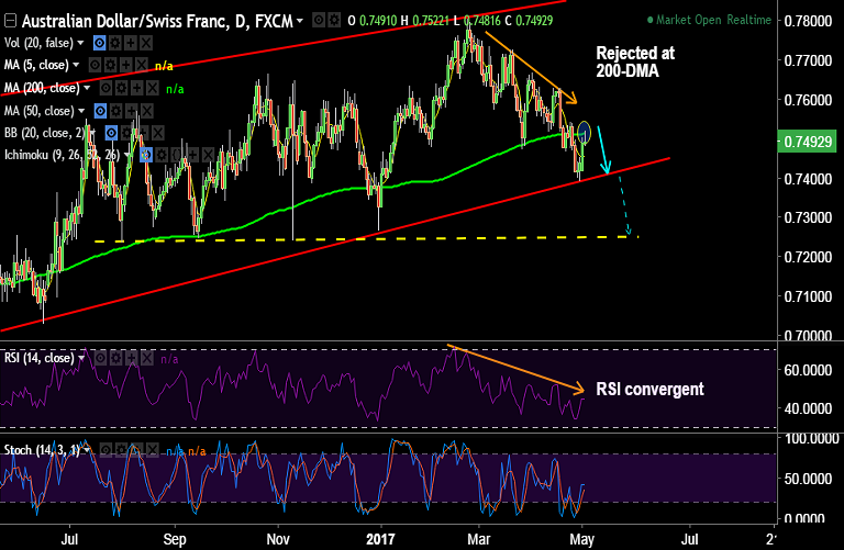 - AUD/CHF rejected at 200-DMA, the pair has edged lower from highs of 0.7522 to currently trade at 0.7494.