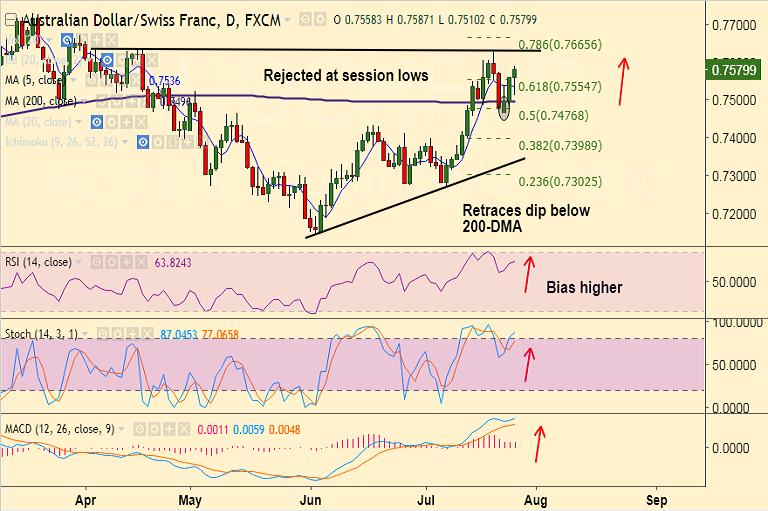 - AUD/CHF rejected at session lows at 0.7510, edges higher to reverse dip below 5-DMA.