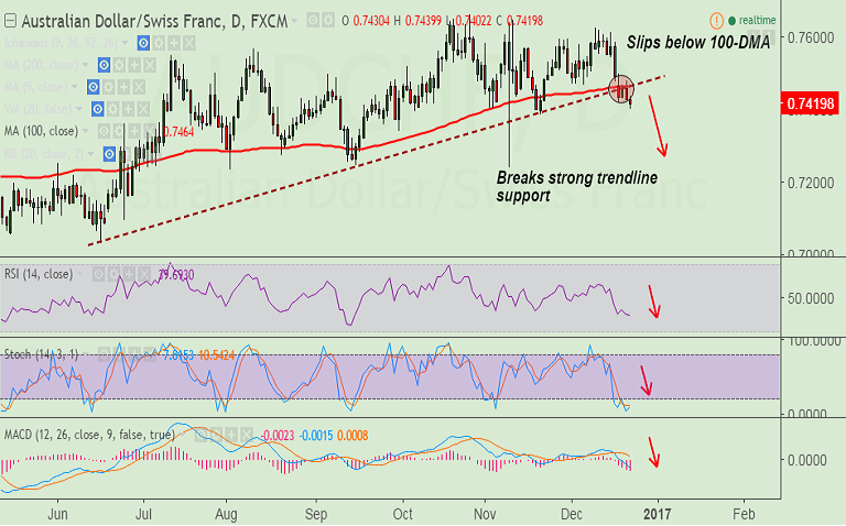 - The pair has broken below major trendline support at 0.7460 and 100-DMA at 0.7464.