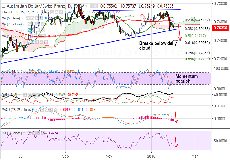 - Price action has dipped below daily Ichi cloud and 38.2% Fibo at 0.7548.