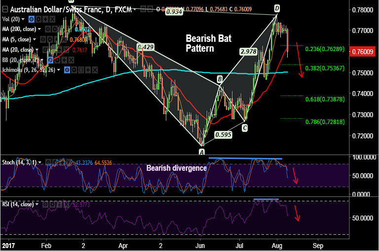 - Technically, we note a 'Bearish Bat Pattern' on AUD/CHF daily charts which combined with bearish divergence has seen downside.