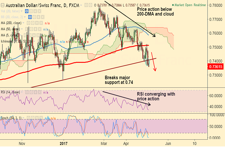 - The pair has breached major trendline support at 0.74 raising scope for test of 0.7250 levels.
