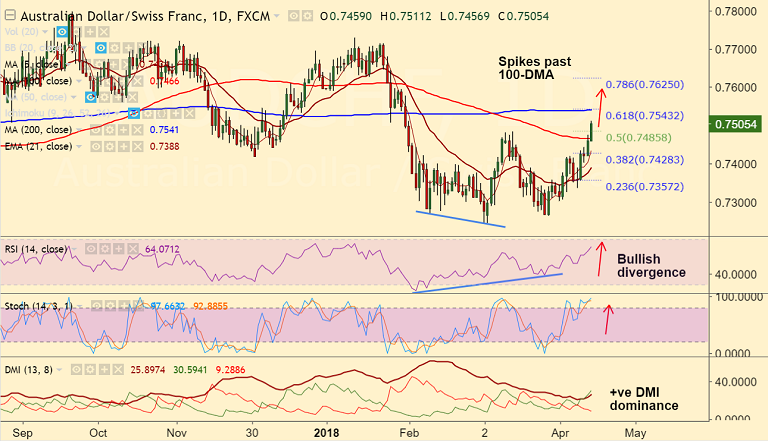 - AUD/CHF spikes past 100-DMA, hits 3-month highs at 0.7511 before paring some gains to currently trade at 0.75 levels.
