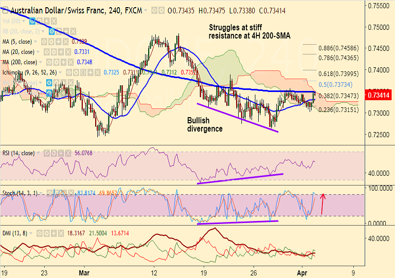- AUD/CHF struggles to break above stiff resistance at 4H 200-SMA at 0.7348.