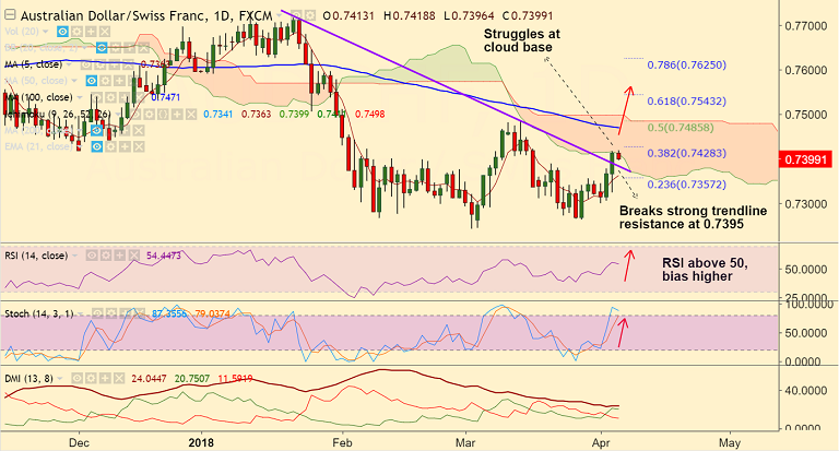 - Price action has broken major trendline resistance at 0.7395 and we see scope for test of 100-DMA.