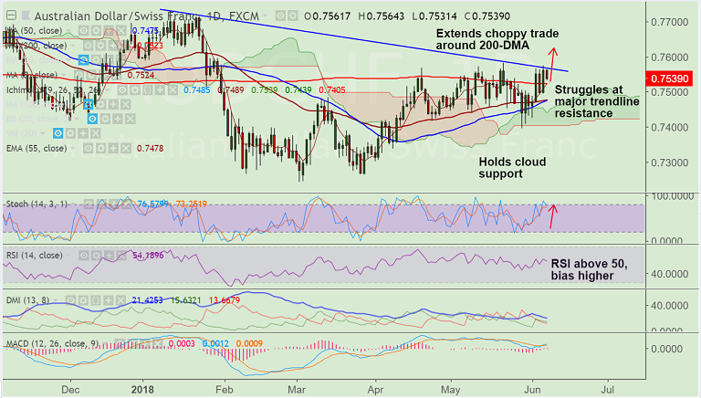 - The pair extends choppy trade around 200-DMA, break above 0.7570 to see further bullishness.