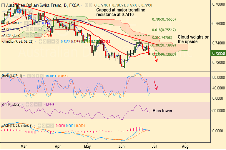 - AUD/CHF fell to 3-week lows at 0.7278 on Tuesday's trade, bias still lower.