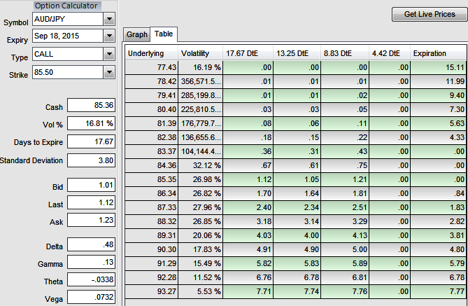 Secondly, time decay advantage: Using near month contracts or contracts shorter tenor on short side signifies the importance of entering the position when IV is lower than average but AUDJPY IV is seen at 10% which is quite higher side (due to data season), so let us keep maturity on short side as normal as near month contract period. Time decay and implied volatility work in your favor on the short puts.