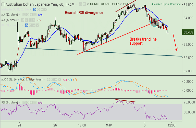 - On hourly charts, we have seen a bearish RSI divergence and break below trendline support at 83.85.