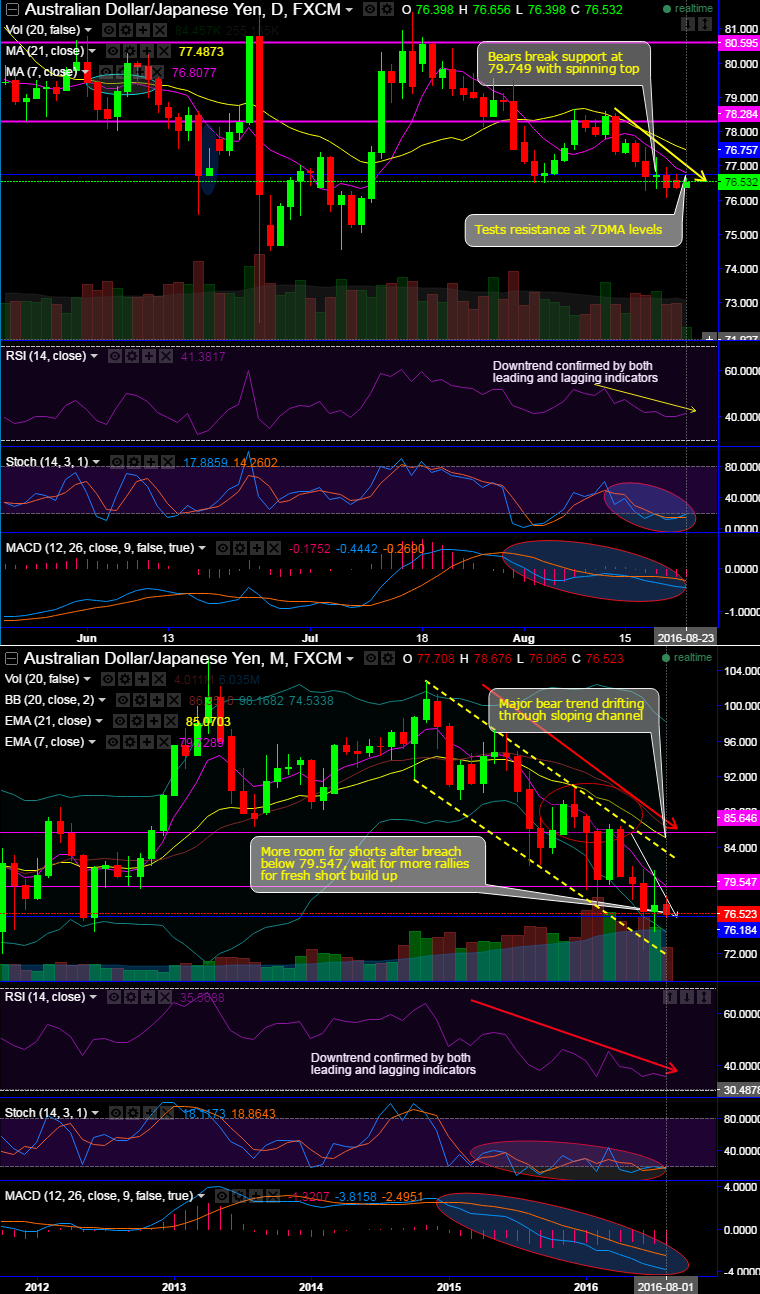 AUDJPY has broken below supports at 76.749 levels with a spinning top formation, currently, the bears have again snapped the recent gains at the same resistance levels.