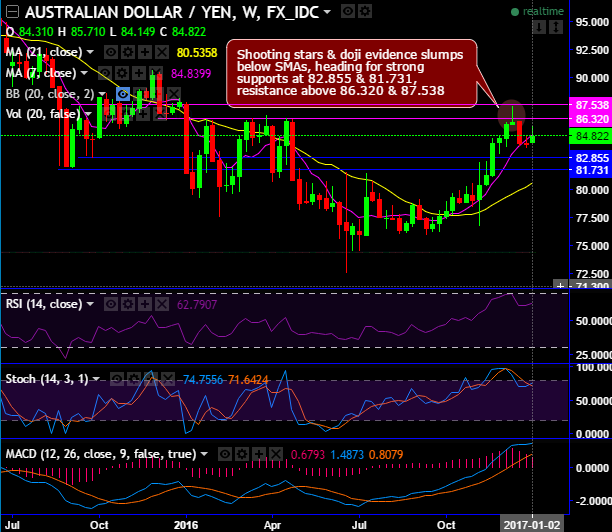 Please also be noted that the shooting star & doji patterns are traced out on daily plotting at 86.102 and 84.124 levels respectively that evidence slumps below SMAs, heading for strong supports at 82.855 & 81.731, resistance above 86.320 & 87.538.