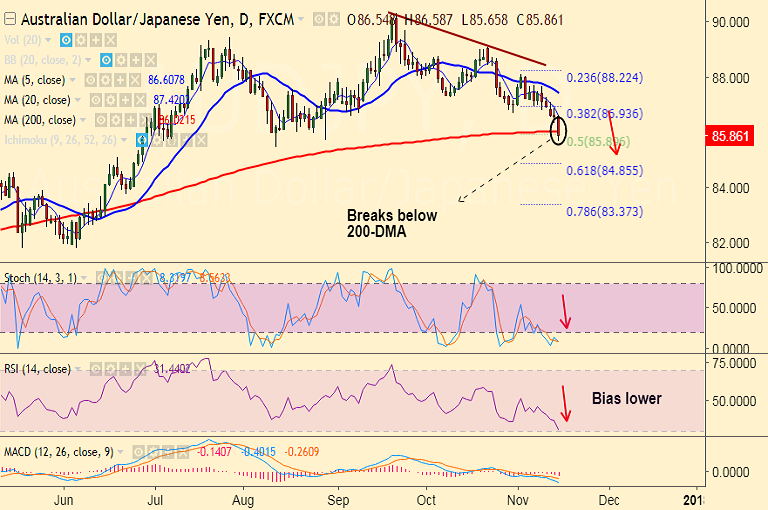 - AUD/JPY has broken below major 200-DMA support at 86.02, hits 3-month lows at 85.65.