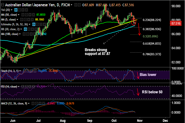 - AUD/JPY breaks below strong support at 87.87 which is converged 50-DMA and trendline.