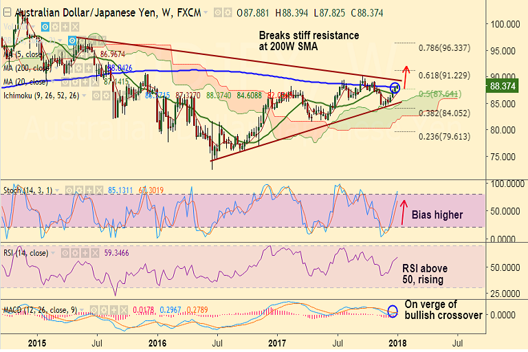 - AUD/JPY has shown breakout at stiff resistance at 200W SMA at 88.04, bias higher.