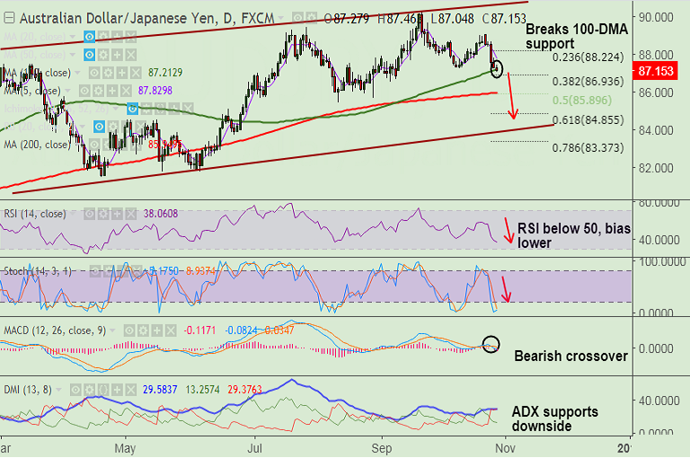- AUD/JPY has breached 100-DMA support at 87.21, hit 7-week lows at 87.048.