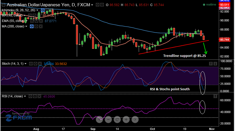 - AUD/JPY breaks below daily cloud, downside stalled at 85.63 and the pair has edged slightly higher to trade at 85.75