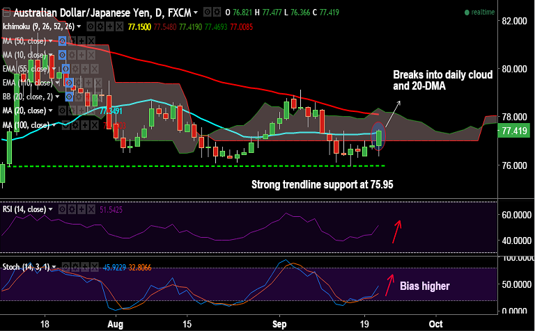 - Price action has cleared 20-DMA resistance at 77.34, scope for test of 100-DMA at 78.10.