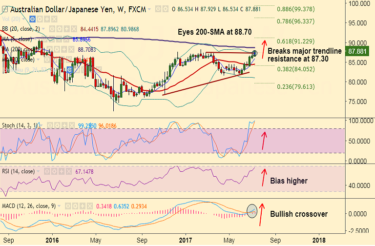 - AUD/JPY has broken major trendline resistance at 87.30, bias remains higher.