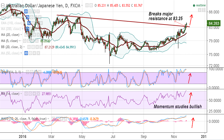 - AUD/JPY has broken major trendline resistance at 83.25 levels.