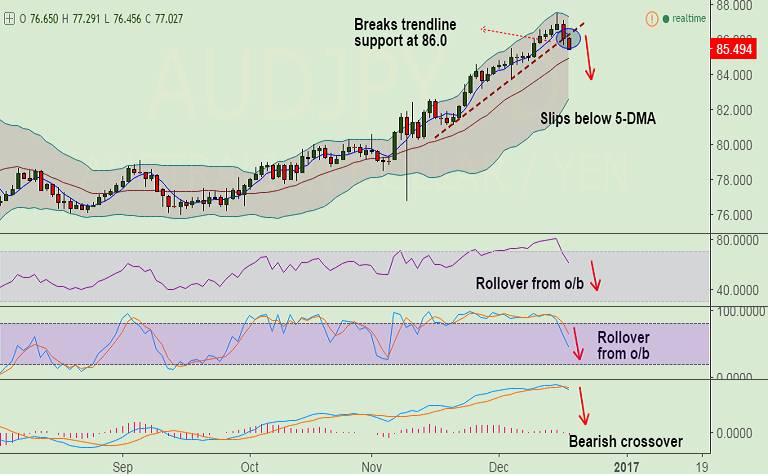 - AUD/JPY breaks major trendline support at 86, remains capped below 5-DMA.