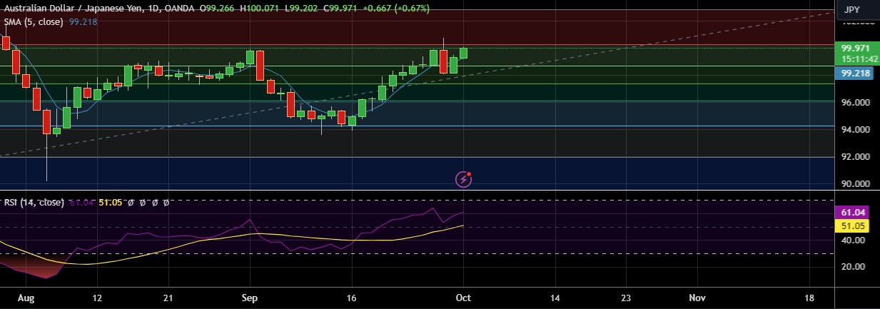 • By 05:47 GMT, Australian dollar was up 0.66% against the yen to 99.66, highest level since September 27th.