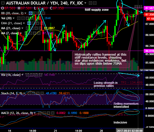 We see stiff resistance at peaks of 87.587 levels, historically, the rallies are hampered at these stiff resistance levels, where shooting star also evidences weakness at the same juncture.