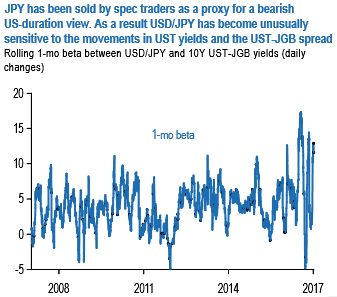 Aside from the trade issue, the yen remains highly sensitive to US yields (the beta of USDJPY to UST yields is the highest in a decade – refer 1st chart), not so much because Japanese investors are taking advantage of higher yields (they have divested out of foreign bonds since the US election – refer 2nd chart), more that short-term traders regard USDJPY as an effective proxy for a short US duration view given the BoJ’s cap on JGB yields.