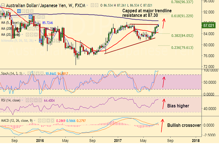 - AUD/JPY was capped at major trendline resistance at 87.30, bias remains higher.