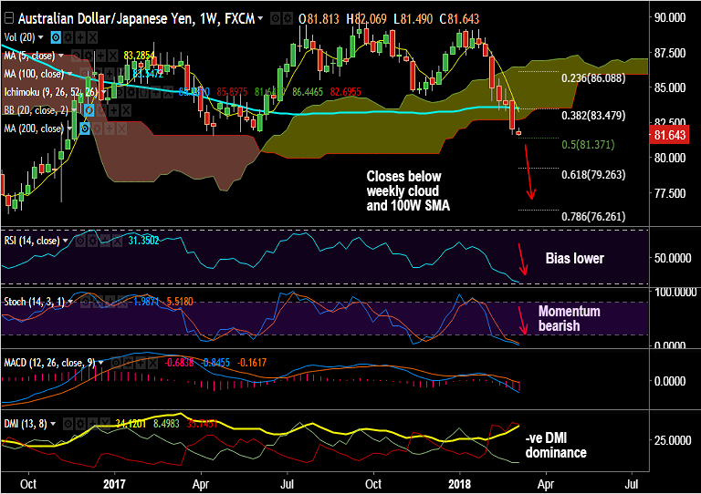 - AUD/JPY has closed below weekly cloud and 100W SMA in last week's trade.