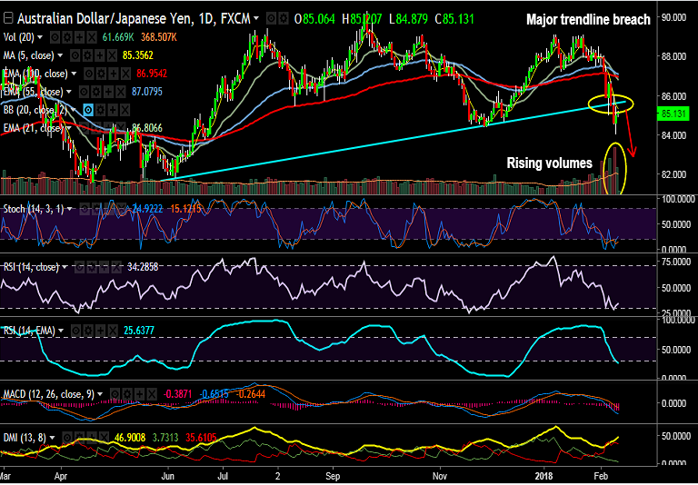 - AUD/JPY is consolidating break below major trendline support at 85.50, bias still lower.