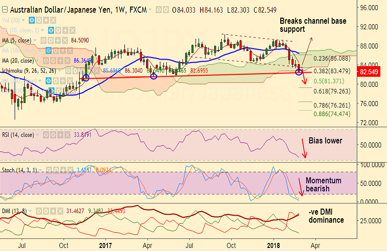 - The pair has dipped below weekly cloud at 82.69 and we see further weakness on decisive break below.