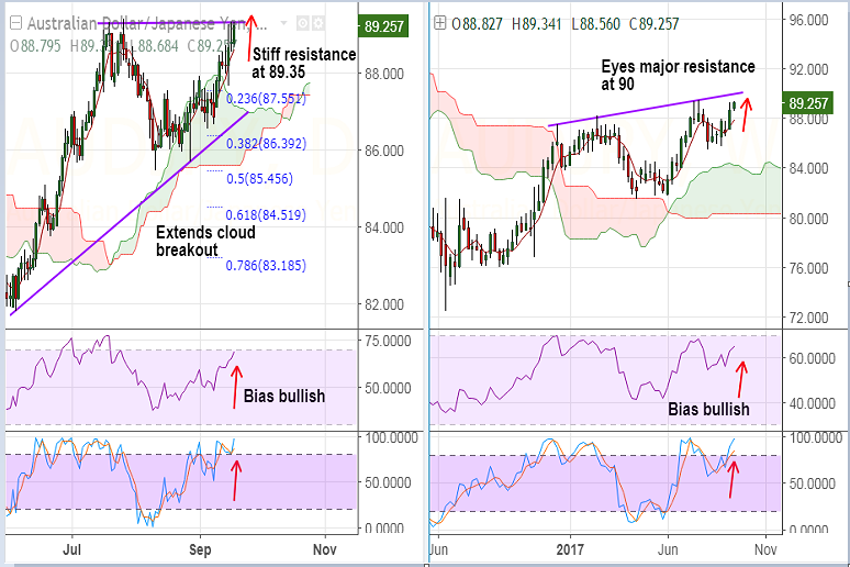 - Next major resistance lies at 90 level, break above could see test of 90.48 (Dec 2015 high).