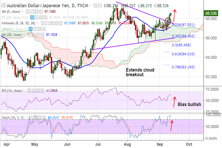 - AUD/JPY extends breaks above daily Ichimoku cloud, hits new 6-week highs at 88.48.