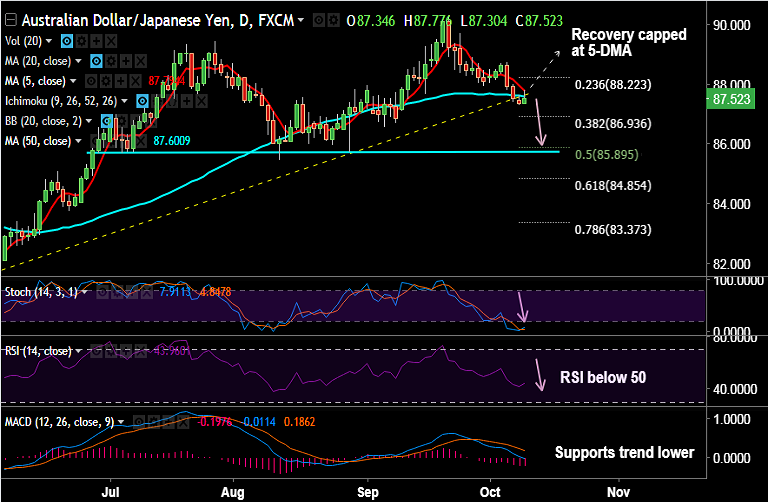 - Bias lower as long as pair holds below 5-DMA at 87.78. Break above could see minor upside till 20-DMA at 88.46.