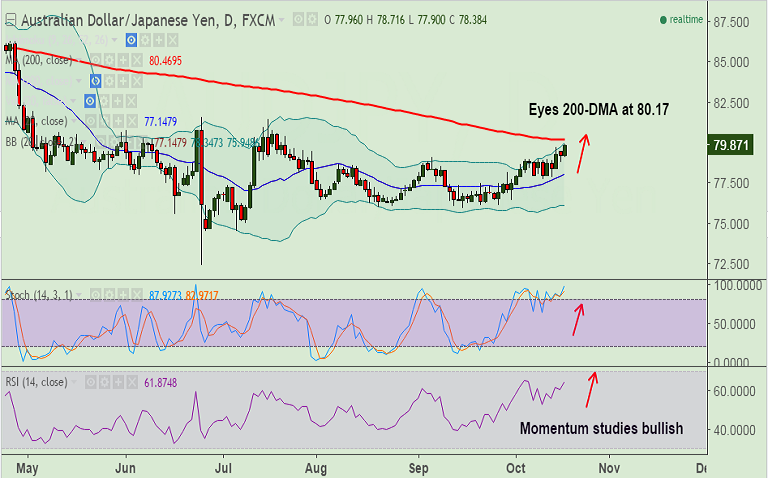 - AUD/JPY extending bullish drift from yesterday, eyes 200-DMA at 80.17.