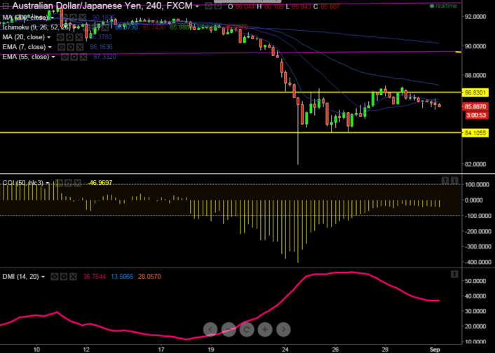 AUD/JPY has made a low of 81.89 on Monday and recovered till 87.15. Overall trend is weak as long as resistance 87.35 holds.