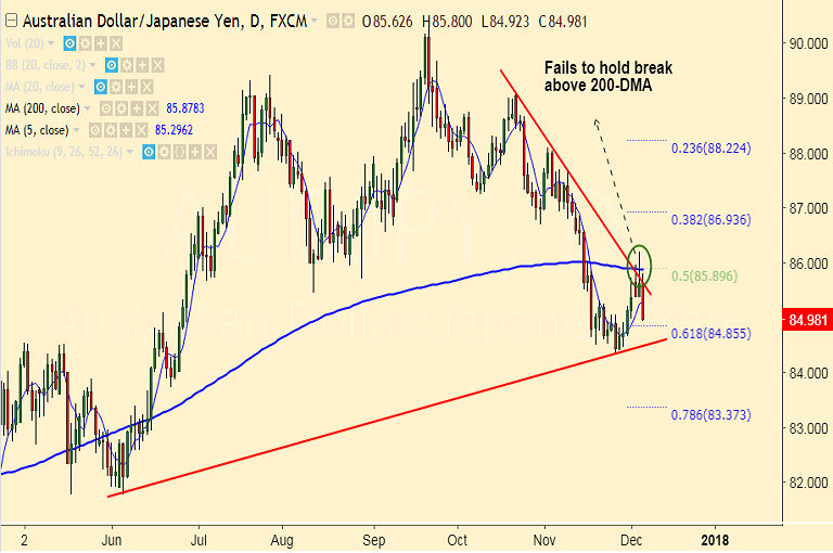 - AUD/USD has failed extend gains above 200-DMA, slips lower to trade at around 85 levels.