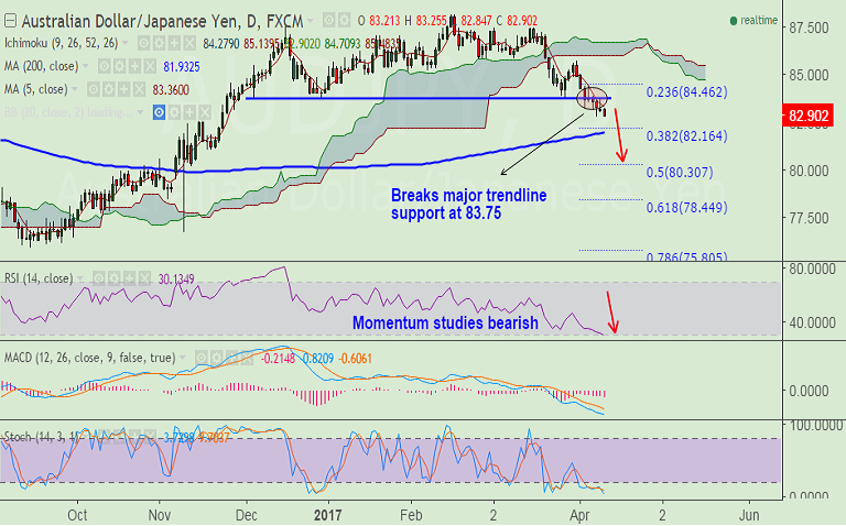 - Momentum studies bearish after the pair broke major trendline support at 83.75.