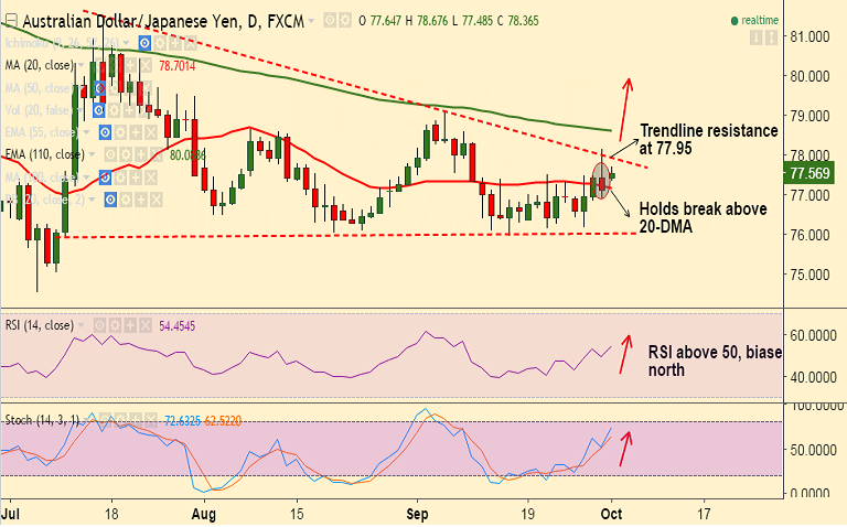 - Pair holds gains above 20-DMA at 77.17, which is now strong support on the downside.