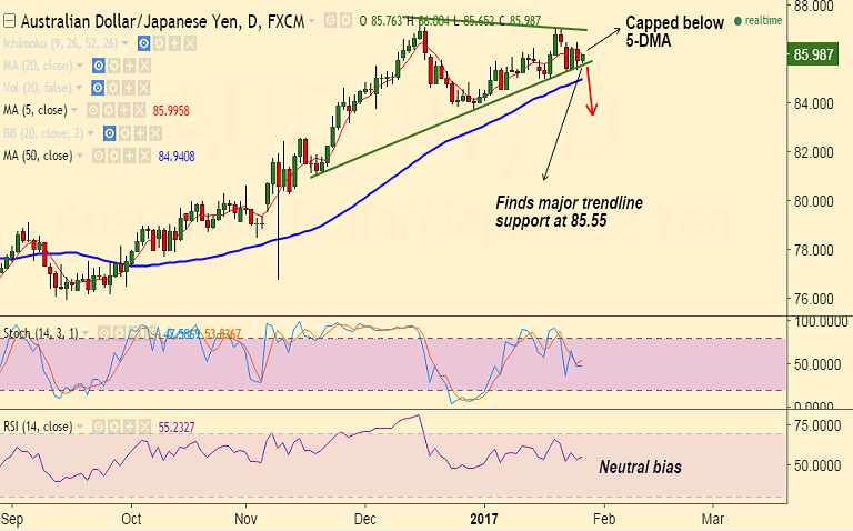 - Resistance levels - 86.0 (5-DMA), 86.28 (Jan 13 high), 87 (trendline).