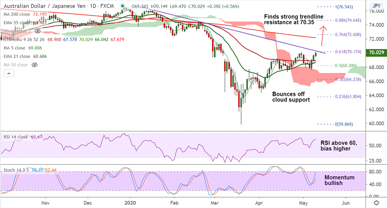 Break above 70.35 will take the pair higher to test 200-DMA at 72.19. 200-DMA breakout will open upside.
