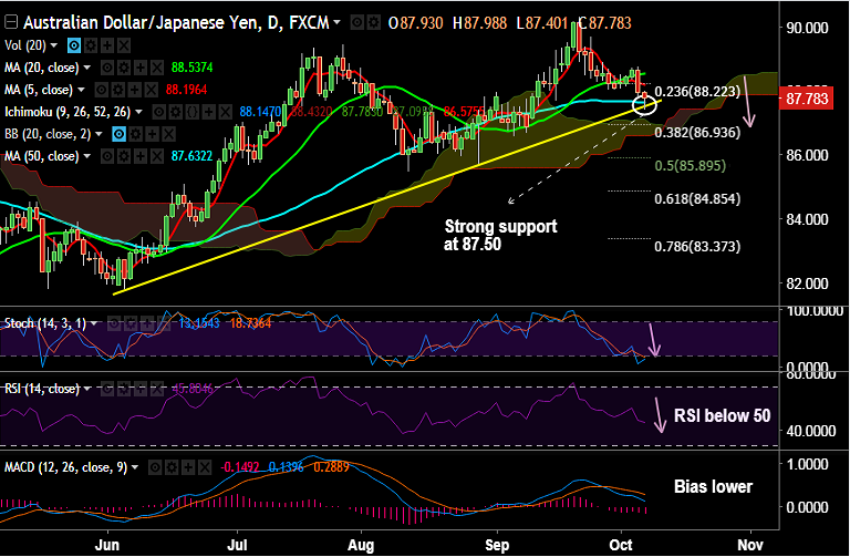 - AUD/JPY finds strong support at 87.50 (rising trendline), we see weakness to extend on break below.