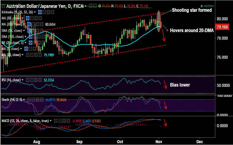 - 'Shooting star' formation seen on AUD/JPY daily charts, close below 20-DMA to see drag lower.
