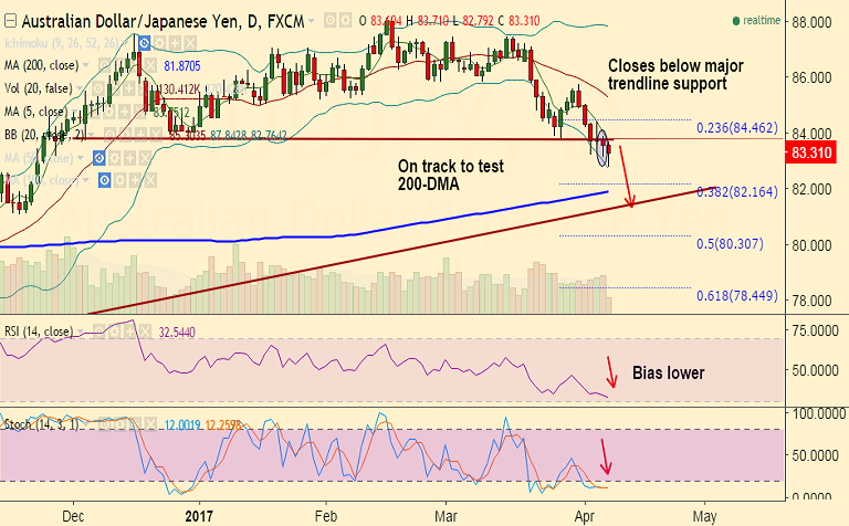 - AUD/JPY has closed below major trendline support at 83.75, adds to weakness.